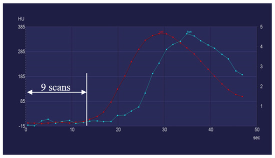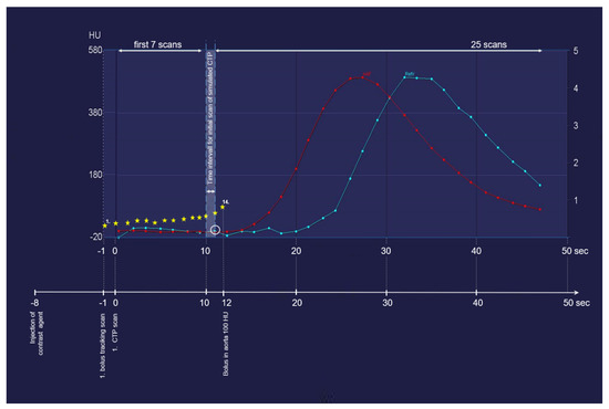 The classic CTP protocol recommended by Wintermark et al., applying a 40 s scanning window starting 7 s after the contrast injection, has similar characteristics to the protocol we used, with a delay of 8 s, a scanning window of 46.5 s and a scan interval of 1.5 s [25,26].