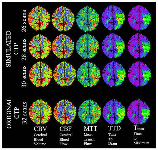 Visually identical perfusion maps of the original and the simulated examinations operating with 30, 28 or 26 scans.