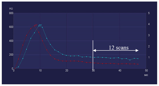 Furthermore, PRR values showed no more than 5% deviation in 75.8% of sCTP24 (50 patients) and 62.1% of sCTP22 (41 patients) compared with the oCTP series. These results suggest that, in certain cases, a further dose reduction could be achieved by lowering the number of scans to 24 or even to 20. Underlying this, 10.6% of the sCTP20 (7 patients) had PRR values that were more than 99% identical to oCTP series. These results indicate that, in these cases, the number of scans could be decreased to 20 without any impairment of the diagnostic quality, which corresponded to a 28.5 s-long scanning window and a dose reduction of 37.5%. The duration of the wash-in and wash-out phase took less than 24 s in these patients, and they also had a very fast aortal bolus arrival as well as an early arterial and venous inflow peak. The flow curves of a corresponding patient are visualized in Figure 4.