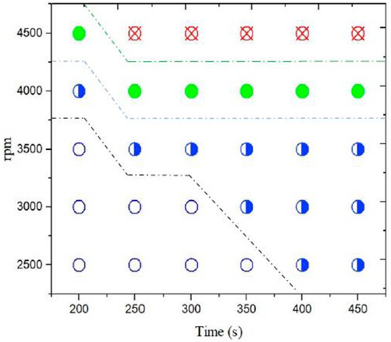 The relationship between CF force, time, and gel displacement. The blank circles, half-filled blue circles, full green circles, and red cross circles represent no plasma separation/no gel displacement, plasma separation/no gel displacement, plasma separation/gel displacement, and erythrocyte rupture, respectively.