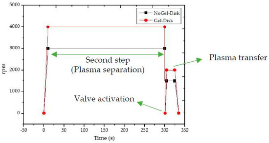 The plasma separation steps for the Gel-Disk as well as NoGel-Disk were identical (Figure 4). Both Gel-Disk and NoGel-Disk had a rapid initial acceleration to 4000 and 3000 rpm in 10 s, respectively. Then, the separation step, as the second step, lasted 300 s. The third step was the activation of the valve, which occurred with a sudden stop of the disk in one second and then rapid acceleration to 2000 rpm and 1500 rpm for Gel-disk and NoGel-Disk, respectively. In the final step, the disk continued to rotate at the given speed for 10 s to transfer the plasma to the next chamber and then gradually slowed down to stop completely in 10 s. Figure 4 shows the speed protocol of the both disks. All rotations were clockwise.