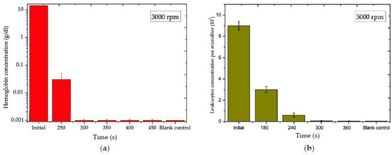 (a) Effect of time on the hemoglobin concentration at 3000 rpm for NoGel-Disk. (b) Effect on time on the white blood cells concentration for NoGel-Disk.
