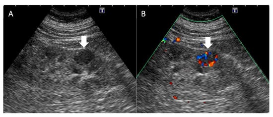 Ultrasonography of this case. (A) Ultrasonography reveals a hypoechoic nodule in the renal parenchyma of the right kidney (arrow). (B) Color Doppler imaging shows increased peripheral vascularity of the lesion (arrow).