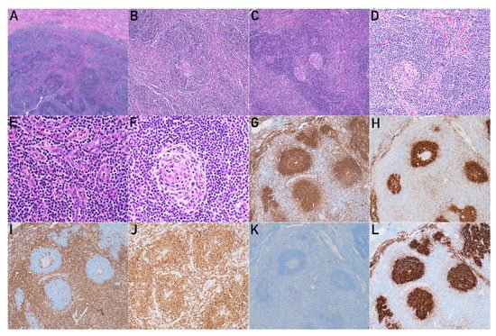 Grossly, a well-defined unencapsulated tan soft nodular lesion (1.3 × 1.3 × 1.1 cm) was noted in the parenchyma of the lower portion of the kidney. Pathology revealed a well-delineated lesion composed of hyperplastic lymphoid follicles (Figure 4A) with an expanded mantle zone of small lymphocytes and atrophic germinal centers, forming an “onion skin-like” structure (Figure 4B,F). Some of the mantle zones fused and contained more than one germinal center, resulting in a “twinning” feature (Figure 4C). In addition, many of the follicles were penetrated by capillaries and showed a “lollipop” appearance (Figure 4D). In the interfollicular areas, there was an extensive vascular proliferation of high endothelial venules with perivascular hyalinization. Scattered plasma cells dispersed in the interfollicular regions in the absence of sheet aggregation were recognized (Figure 4E). Immunohistochemistry (IHC) stains were performed on selected blocks and showed that the lymphoid follicular centers were immunoreactive for CD20 (Figure 4G), and the thickened mantle zones were simultaneously positive for CD20 and IgD (Figure 4H). In contrast, staining for CD3 (Figure 4I) and Bcl-2 (Figure 4J) in the germinal center and cyclin D1 (Figure 4K) were all negative. CD21 (Figure 4L), which highlighted follicular dendritic cells and revealed proliferations.