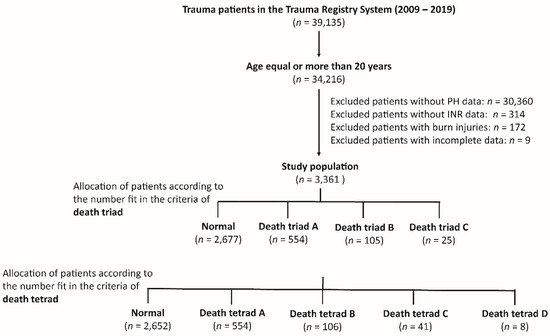This study reviewed registered medical information from the registered trauma database between 1 January 2009 and 31 December 2019 in a Level I trauma center that provides care to trauma patients in southern Taiwan [19,20,21]. All registered data were prospectively collected from two licensed registers of hospitalized trauma patients. As shown in Figure 1, the eligibility of 39,195 hospitalized trauma patients was assessed. After excluding those aged <20 years, those lacking PH data (n = 30,360), lack of INR data (n = 314), patients with burn injuries (n = 172), and those with incomplete registered data (n = 9), 3361 patients were enrolled in the study for further analysis. First, trauma patients were grouped according to number fit in the components of the death triad. Patients with one, two, and three items fit in the components of the death triad and were allocated into death triad groups A, B, and C, respectively (Figure 1). With hypotension, defined as a non-invasive measurement of systolic blood pressure (SBP) < 60 mmHg at the triage station when patients arrived at the emergency department, as one component of the death tetrad, further grouping was performed according to the number fit in the components of the death tetrad. Patients with one, two, three, and four items fit in the components of the death tetrad and were allocated into the death tetrad groups A, B, C, and D, respectively (Figure 1).