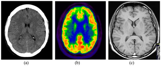 Brain imaging using different modalities: (a) CT, (b) PET, (c) MRI.