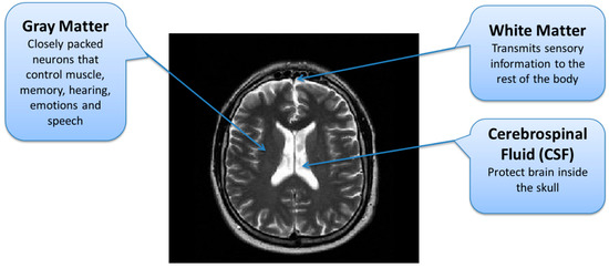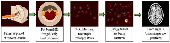 In the brain MRI procedure, large magnets produce a magnetic field in the range 0.2 T to 7 T (average 1.5 T). The subject is placed inside this magnetic field and excited hydrogen atoms inside the body, due to the presence of water molecules, emit radio frequencies that are captured in the large enclosed area of the MRI scanner. These frequencies are used to generate the images inside a computing system. Various brain MR image modalities are obtained by changing the magnetic field strength. The large magnets’ coils are switched to on and off states to detect the timing information of the hydrogen atoms’ realignment into an equilibrium state. The process typically takes from 20 to 45 min to complete and is shown in Figure 2.