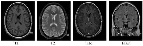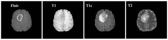 Samples of these four modalities (T1, T2, T1c, Flair) are presented in Figure 6. All four modalities have 620 MR images which make a total of 239,320 MR images for all 384 cases and a total of 169,880 MR images 274 train images as shown in Table 2. In BraTS dataset, labels are provided only for the train images so only train images are used for experiments. The dataset is divided into 60% for training, 20% for validation and 20% for the testing. BraTS provides data in MetaImage (.mha) format which is used to store 3D medical images. For each modality of every case, there are 155 slices with 240 × 240 pixel dimensions which are stored in a single mha file.