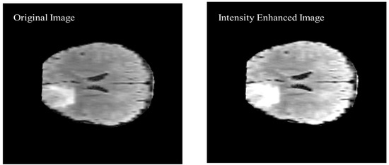 As shown in Figure 9 of the proposed algorithm, image intensity values were manipulated to enhance the segmentation by saturating the highest 1% and lowest 1% of all the pixel values in the MR image which enhances the contrast of the grayscale image. The enhancement method was applied to all the images before converting the image to black and white. The visual results are shown in Figure 10 to compare the original brain MR sample image and the intensity manipulated image.