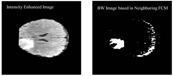 The previous two and following two images are used as a reference along with the actual image to calculate the threshold value for the segmentation. Figure 11 shows the black and white (BW) binary image generated based on the neighboring FCM threshold applied to intensity-enhanced MR image.