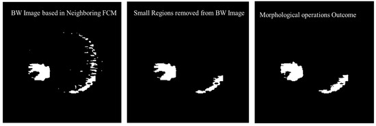 Morphological operations are applied for further enhancement of the tumor region in the binary image. Small regions in the binary are removed based on the connected pixel count values of less than 256 from the MR image having total 57,600 pixels. Erosion and dilation morphological operations with a structure size of pixels are applied to fill the small gaps in the binary image. Figure 12 shows the visual results after removing the small regions from the binary image and applying the morphological operations (erosion and dilation).