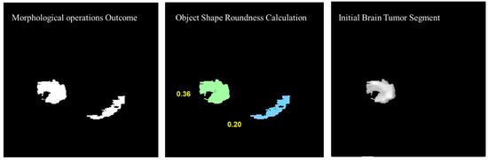 To remove the non-tumor parts from the binary image, the number of objects was calculated in the binary image and the tumor region was selected based on the shape roundness properties of the objects. In Figure 13, objects’ roundness properties are measured from the binary image and the roundness values for each object are displayed. The initial brain tumor segment is extracted based on the best roundness value.