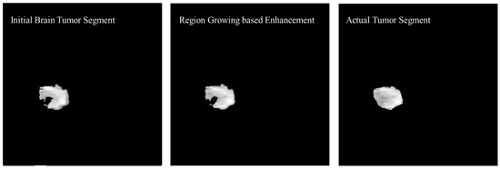 Enhancement in the initial brain tumor segment by applying region growing method and visual comparison with the actual tumor segment.