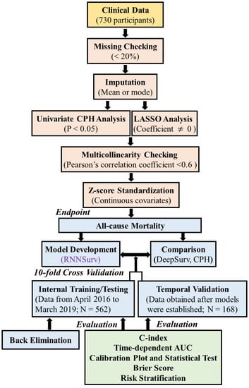 The multivariate CPH model is the most-used survival model to fit the relationship between patients’ covariates and outcomes [27]. However, its prediction ability may be limited by linear assumptions. Recently, Bazoukis et al. concluded that machine learning methods were important and effective for diagnosis, management, and prediction of outcomes in HF patients [28]. In addition, instead of expensive imaging measurement, Liu et al. reported a cheap method to estimate LVEF achieved by machine learning algorithms [29]. Coincidentally, a modern CPH feed-forward deep neural network model (DeepSurv) was proposed as an alternative method for survival or risk prediction [8,9]. The neural network-based model could learn and capture more complex and abstract features and feature combinations from input covariates by nonlinear activation functions in layers. Both CPH and DeepSurv assume that covariates or predictors are invariant. However, some covariates are time-varying due to treatments such as polypharmacy in real-world situations, which are informative and reflect the course of disease. These temporal features should be considered in prediction models. Conversely, the proposed RNN-based prediction model could “remember” previous information and use it for current decision-making; therefore, it naturally accepts and considers time-varying predictors by serially learning.