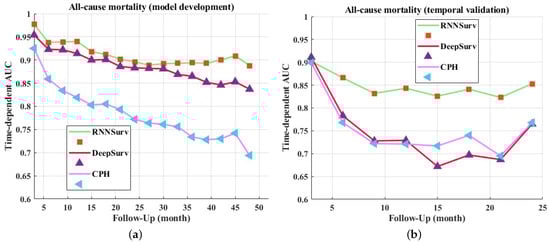 In addition to the C-index, the time-dependent AUCs of every 3 months are visualized in Figure 3. The upper boundary was set at 4 years for the development dataset and 2 years for the validation dataset to avoid high censoring rates at later follow-up times. The proposed model outperformed DeepSurv and CPH on both the development (Figure 3a) and validation datasets (Figure 3b).