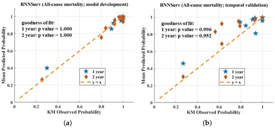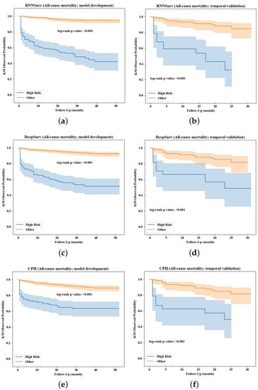 The prediction performance was further evaluated in view of the ability of risk stratification. Kaplan–Meier survival curves of high-risk and other (non-high-risk or low-risk) patients stratified by the three models are visualized in Figure 6. Compared with DeepSurv (Figure 6c,d) and CPH (Figure 6e,f), the survival curves of high-risk patients stratified by the proposed RNNSurv (Figure 6a,b) had more obvious differences from other patients on both the development and validation datasets, indicating a better ability of risk stratification. Mortality in the high-risk patient group and other or low-risk patient group stratified by RNNSurv had a significant difference (51.8% vs. 5.1%, p < 0.001 on the development dataset; 48.5% vs. 8.9%, p < 0.001 on the validation dataset). Patients with high risk of all-cause mortality were older, were more often female, had a heavier burden on their medical history in terms of IHD and vascular disease (VD), had a longer length of stay and severe HF symptoms assessed by NYHA and heavier burden on daily activities, and were more likely to have chronic kidney diseases compared with low-risk patients. Details are illustrated in Supplementary Table S6.