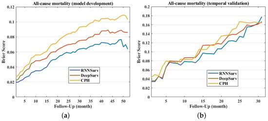 The Brier score of the proposed model was smaller than those of DeepSurv and CPH on both the development and the validation datasets, as shown in Figure 5, indicating a better overall performance. In detail, the mean ± standard deviation of Brier scores of RNNSurv, DeepSurv, and CPH were 0.054 ± 0.017, 0.066 ± 0.020, and 0.080 ± 0.025 on the development dataset, and 0.099 ± 0.039, 0.107 ± 0.039, and 0.112 ± 0.040 on the validation dataset, respectively.