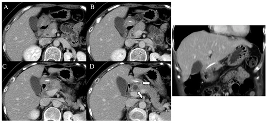 Contrast-enhanced CT imaging with serial sections in the axial (A–D) and coronal planes displaying a linear and hyperdense foreign body penetrating through the posterior wall of the gastric antrum into the pancreatic head. The white arrows indicate abscess formation in the pancreatic head and near the ingested foreign body.