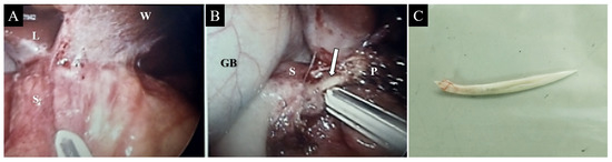 A 49-year-old woman without any underlying conditions presented to our emergency department with worsening dull epigastric pain for over 2 months, general soreness, and fever for 2 days. Physical examination revealed fever up to 39.1 °C with tenderness over the epigastric area; no other complications were reported. Laboratory data indicated a white blood cell count of 8400/µL (neutrophils 88.7%) and a mildly elevated level of C-reactive protein (3.6 mg/dL). The liver function test results and pancreatic enzyme levels were within normal limits. Furthermore, abdominal sonography revealed a small hypoechoic lesion in the hilar area of the liver, and esophagogastroduodenoscopy barely revealed superficial gastritis without mucosal protrusion or ulcer suspiciously indicating the site of foreign body penetration or other etiology. Further investigation was performed through abdominal computed tomography (CT) that revealed a 2.7 cm radiopaque foreign body located between the prepyloric region of the stomach and the pancreatic head and a multiloculated abscess in the pancreatic head and near the aforementioned foreign body (Figure 1). The patient recalled swallowing a piece of fish bone accidentally 2 months prior. Gastric perforation with pancreatic abscess secondary to the fish bone penetration injury was suspected. Considering the length of the fish bone, extraluminal migration, and concurrent multiloculated pancreatic abscess, she was admitted to the hospital and received laparoscopic surgery for removal of the fish bone. The intraoperative findings were a 4 cm long fish bone penetrating through the posterior wall of the gastric antrum into the pancreatic head (Figure 2B,C) and adjoining the pancreatic abscess, and a severe adhesion between the distal stomach and liver, which was identified (Figure 2A) and removed through adhesiolysis. Antibiotic treatment was administered for postoperative symptomatic and supportive treatment. The patient recovered well and was discharged on the seventh postoperative day. No complications were noted in a subsequent health checkup 1 year after the operation.