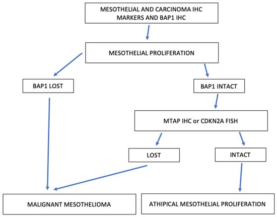 It is important to note that the WHO diagnostic criteria also include the absence of the nuclear expression of p16, the encoding CDK2 gene, which is better detected using a surrogate of p16 called MTAP [,,,,,,,,,,,,,,,,,,,,,,,,,,,,,,,,,,,,,,,,,,,,,,,,,,,,,,,,,,,], a protein encoded by the homonymous gene situated on chromosome 9, close to the p16 gene. It is a tumor suppressor gene encoding the CDKN2 protein. MTAP is engaged in polyamine metabolism, particularly in the reuptake of adenine and methionine and is often deleted in tandem with the p16 gene due to its proximity [,,,,,,,,,,,,,,,,,,,,,,]. MTAP loss is more common in sarcomatous mesothelioma; on the other hand, BAP-1 loss is more common in the epithelioid form of mesothelioma [].