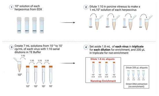 Simulated diluted vitreous samples that mimic vitrectomy specimens were created by diluting (1:10) pure vitreous containing 105 cp/mL (IU/mL for CMV) of viruses in TE buffer (Tris-EDTA, pH = 8.0) to create a 7 mL solution containing 104 cp/mL. Serial dilutions were performed down to 101 cp/mL. Prior to beginning the enrichment, 200 µL of each dilution (104 cp/mL to 101 cp/mL) was placed into a separate 1.5 mL tube in triplicate and set aside to be extracted as the non-enriched samples as shown in Figure 1.