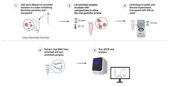 To begin the enrichment process, 180 µL of the Nanotrap Red particles were pipetted into 2 mL tubes (3 for each dilution) and centrifuged at 15,000× g for 10 min to pellet the particles. Once centrifugation was completed, the supernatant was removed carefully as to not disturb the pellet. In triplicate, 1.8 mL of the diluted vitreous samples was added to each tube. The solution was pipetted up and down to resuspend the pellet, careful not to directly poke the pellet. The tubes were then incubated at room temperature for 10 min, making sure to invert the tubes to mix the solution every 5 min. When incubation was complete, the solutions were centrifuged at 15,000× g for 10 min. After centrifugation, the supernatant was removed. The pellet was then resuspended in 200 µL of nuclease-free water. Viral DNA was then extracted using the Zymo Quick-DNA Microprep Plus Kit (Zymo Research, Irvine, CA, USA). For both the enriched and non-enriched samples, 800 µL of Genomic Lysis Buffer (with β-mercaptoethanol) was added to each of the tubes, vortexed, and set to incubate at room temperature for 5 min. After incubation was complete, the solution was added to the Zymo-Spin IC-XM Columns in collection tubes and centrifuged at 10,000× g for 1 min, discarding the supernatant. This was done by adding the solution in 2 increments of 500 µL as to not overflow the columns. Next, 200 µL of the DNA Pre-Wash Buffer was added to the columns and centrifuged at 10,000× g for 1 min, discarding the supernatant. Lastly, 500 µL of the g-DNA Wash Buffer was added to each of the columns and centrifuged at 10,000× g for 1 min, discarding the supernatant. The columns were then added to clean, 1.5 mL microcentrifuge tubes. Then, 20 µL of DNA Elution Buffer was added directly to the columns and set to incubate at room temperature for 10 min. DNA was eluted by centrifuging at 10,000× g for 1 min. PCR was performed in duplicate for each of the triplicate samples at the 4 dilutions (104 cp/mL to 101 cp/mL) using real-time PCR assays (described above). The process of enrichment, entrapment, and DNA extraction is summarized in Figure 2 and Figure 3. Non-enriched aliquots (200 µL) were extracted in the same manner. PCR for enriched and non-enriched samples was performed in duplicate for each of the triplicate samples at the 4 dilutions (104 to 101) as described above. All PCR reactions were performed with no-template controls (NTCs).