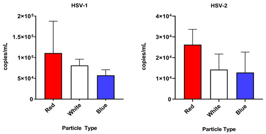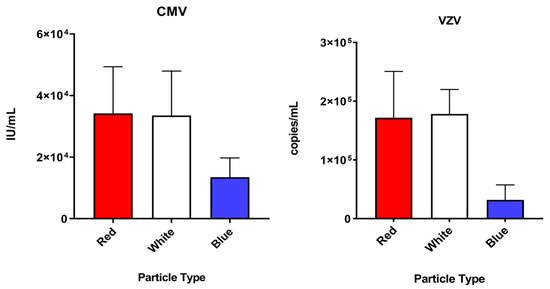 Three types of custom hydrogel particles were provided by Ceres Nanosciences (Manassas, VA, USA), each with different affinity dye functional groups. Nanotrap particle identifiers were created based on the visual color of the suspension for each particle type and are named as follows: Red, White, and Blue particles. Herpes viral verification panels for CMV, HSV-1, HSV-2, and VZV obtained from Exact Diagnostics were used to spike porcine vitreous at a concentration of 105 cp/mL (copies per milliliter) or IU/mL (International Units per milliliter for CMV). Next, 100 µL of the newly created porcine solution was mixed with 100 µL of TE Buffer. The entire solution (200 µL) was added to each type of Nanotrap particle that had already been pelleted (in triplicate for each virus). After incubation, solutions were centrifuged to pellet the captured viral particles and the supernatant was discarded. Pellets were resuspended in 200 µL Buffer AL (QIAGEN, Hilden, Germany). Extraction of viral DNA was performed using the QIAamp® DNA Mini Kit (QIAGEN) and eluted DNA was used for pathogen detection and quantification using a previously validated assay [16]. Each reaction contained 12.5 µL of Express SYBR™ GreenER™ (Thermo Fisher, Waltham, MA, USA), 0.5 µL of the appropriate forward and reverse primers, at 20 µM working stocks, 2.5 µL of template DNA, and 9 µL of nuclease-free water. The reaction was set up in at the following cycling conditions: 50 °C for 2 min, 95 °C for 5 min, and then 40 cycles of 95 °C for 5 s, 60 °C for 10 s (acquiring on green), followed by a high-resolution melt (HRM) that went from 75–95 °C by 0.1 °C/cycle. The gain was set to optimize each run. Results were analyzed using the Rotor-Gene® Q Series Software (version 2.3.5) (QIAGEN). All PCR reactions were performed with no-template controls (NTCs).