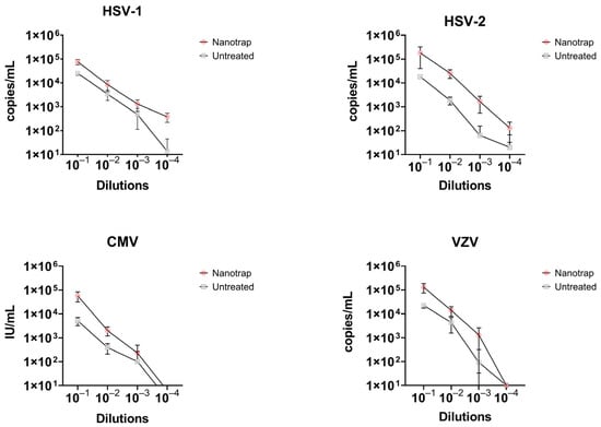 At a viral load of 104 cp/mL (or IU/mL for CMV), the Nanotrap Red provided a 3- and 15-fold increase in detection of HSV-1 and HSV-2, respectively. At lower concentrations, the fold increase ranged from 2.5–2.7 for HSV-1 and 13.6–26.5 for HSV-2 (Figure 5, Table 2). This resulted in limit of detections (LoD) for enriched samples that were 10-fold higher when compared to non-enriched specimens (Table 2). Concentration of viral particles using the Nanotrap Red particles increased the LoD for HSV-1 and HSV-2 from 102 cp/mL to 101 cp/mL. Similarly, a 3.2 to 5.7-fold increase in detection of VZV was obtained for enriched samples, resulting in a 10-fold improvement in the LoD (from 103 cp/mL to 102 cp/mL). For CMV, enrichment with the Nanotrap Red resulted in a 2.3- to 11.1-fold increase in detection (Figure 5, Table 2). Despite of this improvement in signal detection for CMV, the LoD of detection remained the same before and after enrichment for the log10 dilutions included in our study. A two-way ANOVA analysis was performed to compare the enriched and non-enriched samples at each concentration of viral load. The difference for each herpesvirus was found to be statistically significant with a p-value of p < 0.0001.