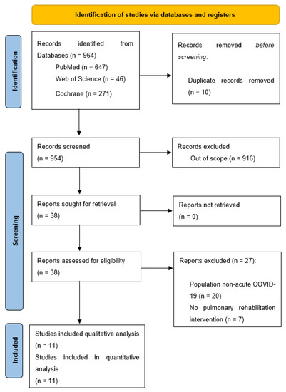 The search for publications resulted in 964 articles, retrieved from different search engines. After clearing the duplicates, 954 articles remained. A title screening identified 38 eligible articles. After the full-text review, only 11 articles were retained for this systematic review, following the eligibility criteria set for this paper. The results are included in Figure 1, according to the guidelines [48].