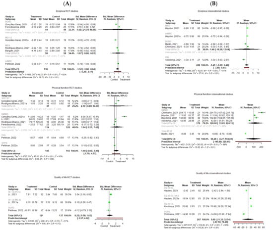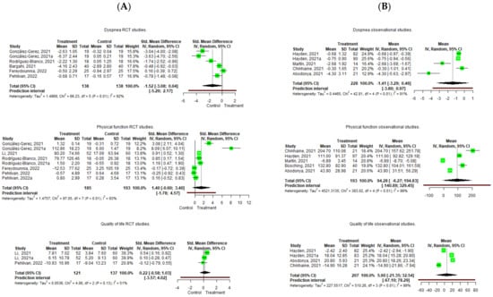 Forest plot of the effect of Pulmonary Rehabilitation in post-acute patients with COVID-19 related to physical function, dyspnea, and quality of life. (A) RCTs assessed; (B) Observational studies assessed.