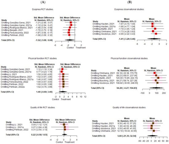 Leave-one-out analysis of the effect of Pulmonary Rehabilitation in post-acute patients with COVID-19 related to physical function, dyspnea, and quality of life. (A) RCTs assessed; (B) Observational studies assessed.