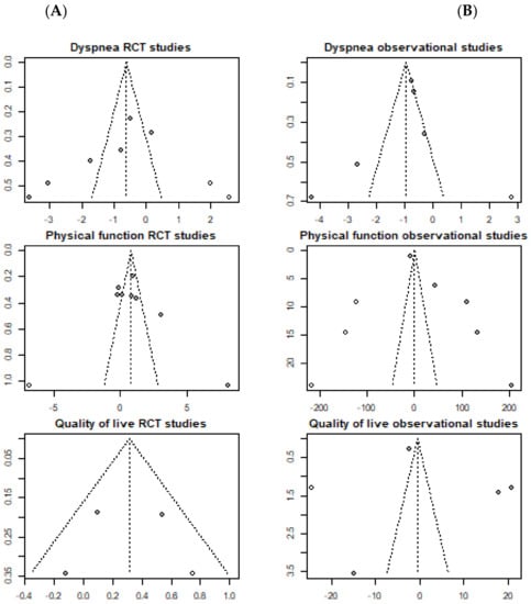 Publication bias of included studies on the effect of Pulmonary Rehabilitation in post-acute patients with COVID-19 related to physical function, dyspnea, and quality of life. (A) RCTs assessed; (B) Observational studies assessed.