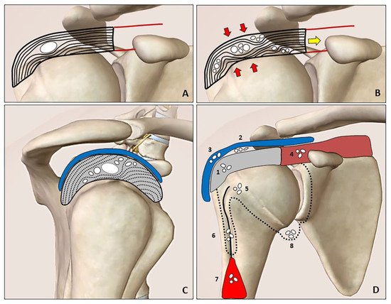 The resting phase is characterized by a hard calcification that shifts the tendon fibers (A). During the resorptive phase (B), the compression (red arrows) and tension (yellow arrow) forces promote slipping of the softly hydrated calcification through the layers/laminae of the tendon (rupture and dispersion of the calcific deposition). The intratendinous bursal-side (cranial direction) and articular side (caudal direction) migration patterns can be clearly identified during the US imaging by “following” the hyperechoic foci of the calcification (white dots) especially in the short axis view (C). Hydroxyapatite calcium crystals (white dots) can develop “migratory patterns”, i.e., moving from the rotator cuff tendons (grey) to several anatomical sites. The spectrum includes the following patterns: intratendinous (1), sub-bursal (2), intrabursal (3), intramuscular (4), intraosseous (5), inside the synovial sheat of the long head of the biceps tendon (i.e., the bicipital recess) (6), between the interfascial planes of the arm (7) and perhaps inside the glenohumeral joint cavity (8) (D). Blue: subacromial bursa, brown: supraspinatus muscle, red: biceps brachii muscle, black line: long head of the biceps tendon, black dotted line: synovium.