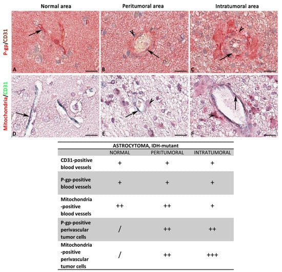 In the present study, we explored the spatial and amount distribution of the P-gp as a drug efflux pump expressed on tumor and ECs plasma membranes [27], mitochondria as an indicator of increased cell activity and proliferation [40], S100A10 as a specific biomarker of glioma cells [33,34,41], and CD31 as ECs marker [42] across different brain tumors: human meningioma, IDH-mutant astrocytoma, and IDH-WT glioblastoma. Double immunolabeling reactions, with antibodies against the proteins mentioned above, were established to evaluate blood vessels in the same area of serial sections for the same bioptic specimens looking at normal, peritumoral, and intratumoral areas.