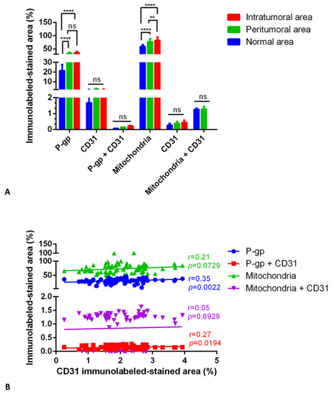 P-gp/CD31 and mitochondria/CD31 quantification in IDH-mutant astrocytoma. P-gp, mitochondria, and CD31 were evaluated by immunohistochemistry and were estimated as a percentage of digital quantification within the same spatial ROIs on IDH-mutant astrocytoma serial sections using the colocalization algorithm. P-gp and mitochondria are significantly overexpressed in peritumoral and intratumoral areas versus the normal one (A). No significant differences are noted in CD31, P-gp + CD31, or mitochondria + CD31 expression in all three areas (A). Linear regression analysis (B) shows a poor or fair statistical correlation between the CD31 expression and the other immunolabeled markers [For P-gp: Y = 2.824*X + 24.30; for P-gp + CD31: Y = 0.01772*X + 0.1134; for mitochondria: Y = 4.024*X + 64.79; for mitochondria + CD31: Y = 0.02627*X + 0.7950]. Data are reported as mean ± SD, and the Tukey’s post hoc test was used to compare all groups after two-way ANOVA. N = 25. ns, not significative; ** p < 0.01; **** p < 0.0001.