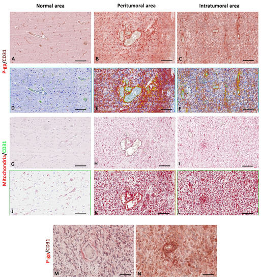 P-gp/CD31 and mitochondria/CD31 expression and colocalization in meningioma. P-gp, mitochondria, and CD31 were evaluated by immunohistochemistry within the same spatial ROIs on meningioma serial sections. P-gp (A–F) and mitochondria (G–L) expression progressively increase from normal to intratumoral areas. CD31 expression is reduced in the intratumoral areas compared with peritumoral and normal ones (A–L). Intratumoral areas show vascular co-option (M,N). Scale bar: (A–L) 100 μm; (M,N) 30 μm. Below each micrograph is the relative markup image generated by the Aperio colocalization algorithm.