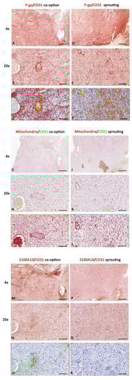 P-gp/CD31, mitochondria/CD31, and S100A10/CD31 expression and colocalization in IDH-WT glioblastoma. P-gp, mitochondria, S100A10, and CD31 were evaluated by immunohistochemistry within the same spatial ROIs on serial sections using the colocalization algorithm. P-gp, mitochondria, and S100A10 expression increase in the tumor area where vascular co-option prevails over sprouting angiogenesis (A–C,G–I,M–O). In the area where sprouting angiogenesis prevails, the CD31 expression (D–F,J–L,P–R) and the P-gp + CD31 co-expression (D–F) are increased compared with the area with a prevalence of vascular co-option (A–C). Scale bar: 4×, 300 μm; 20×, 100 μm. Below each micrograph is the relative markup image generated by the Aperio colocalization algorithm.