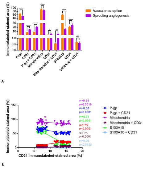 In contrast, in the areas of sprouting angiogenesis, the blood vessels appear with an increased CD31 expression, P-gp/CD31 (Figure 11E), and mitochondria/CD31 (Figure 11K) co-expression, which is indicative of ECs proliferation and migration (Figure 12). The differences in S100A10/CD31 co-expression were insignificant in the two methods of tumor growth (Figure 13A).