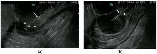 EUS-guided tissue acquisition (EUS-TA) is a minimally invasive diagnostic method consisting of two modalities: EUS-guided fine needle aspiration (EUS-FNA) and EUS-guided fine needle biopsy (EUS-FNB). EUS-TA has been used extensively to obtain samples for histopathological diagnosis of abdominal tumors, particularly pancreatic lesions [19,20]. The average diagnostic accuracies of EUS-FNA for gastrointestinal SELs have been found to range from 60 to 80% [21]. This method, however, is less accurate in the diagnosis of SELs ≤2 cm [22,23]. Moreover, EUS-FNA acquires cytological specimens, making it difficult to obtain histological architecture, and perform immunohistochemical analysis and molecular profiling. By contrast, EUS-FNB, first reported in the early 2000s, acquires tissue specimens rather than aspiration-based cytological specimens.