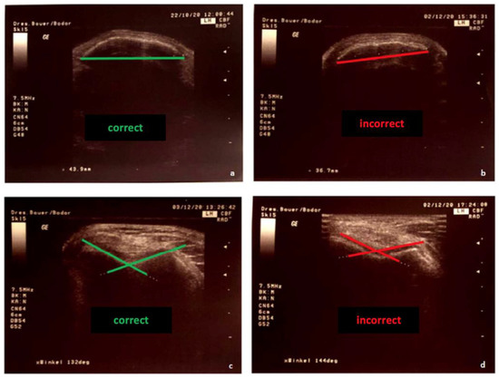 Image settings for sonographic measurement: (a) correct measurement of the patella diameter, (b) incorrect measurement plane, (c) correct positioning of the lines for the angle measurement, (d) incorrect positioning of the lines.