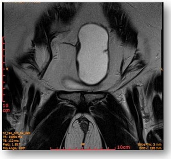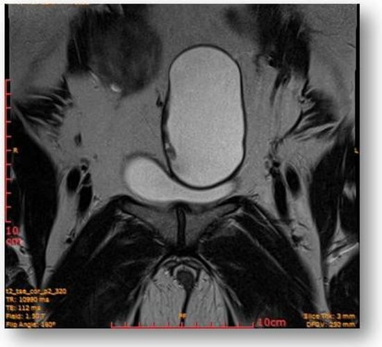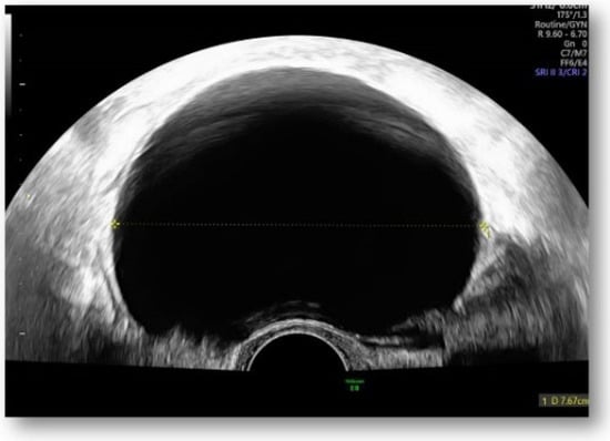 Imaging techniques, such as computed tomography, MRI, and ultrasonography (USG), constitute the radiologic core method of choice and play a pivotal role in differentiating the urachal cysts from other causes [,], providing information about the size and relationship with the peripheral tissue [,,,,,,].