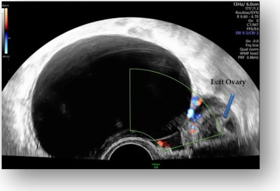 The left ovary, with the long axis of about 32 mm, was located between the anterior pelvic wall and the left external iliac vascular bundle, about 7 cm lateral to the midline showing some follicular (possibly cystic) images up to ~16 mm.