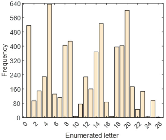where defines value and is the ASCII value conversion function of , the lowercase character. The frequency histogram of the enumerated letters is shown in Figure 3.