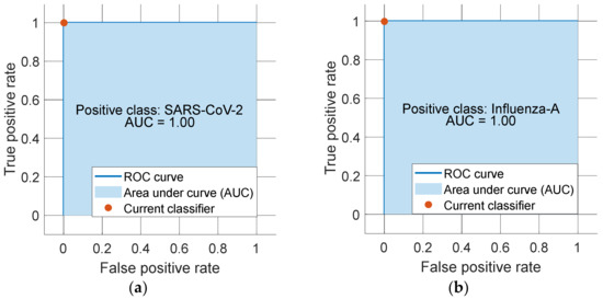 ROC curves of each class (a) SARS-CoV-2 and (b) Influenza-A.