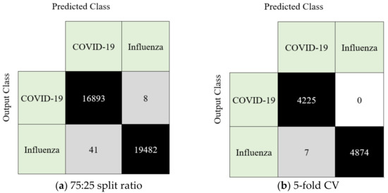 SARS-CoV-2 and Influenza-A are very different pathogens that share important overlapping clinical features. In the current COVID-19 pandemic, SARS-CoV-2 has caused nearly six million deaths worldwide. The H1N1 Influenza-A virus was the cause of the Spanish flu that infected one-third of the world’s population and killed millions from 1918 to 1920 [30]. Subsequent influenza-related pandemics had less-severe consequences [31]. According to the World Health Organization, about half a million people, mostly the elderly, die from seasonal influenza cases each year [3]. Both viruses are transmitted through the respiratory tract, and it is possible to be protected with non-pharmacological interventions such as masks [32]. Measures were taken amid the COVID-19 pandemic, and a reduction in global travel has caused a decrease in the number of seasonal influenza cases. However, it is expected that influenza cases will rise as the level of international travel is slowly being restored. Distinguishing infection from SARS-CoV-2 vs. Influenza-A is clinically difficult in the early stages of infection. It is also important to keep in mind the possibility of co-infection, which can exacerbate the clinical prognosis. During the influenza season, it is difficult to confidently secure clinical diagnosis due to similar symptom presentations, such as fever, cough, and dyspnea. In this context, real-time polymerase chain reaction and nucleic acid tests can be performed on suspected patients to determine the viral etiology and institute appropriate treatment and, if applicable, isolation procedures. Our main motivation in this study was to create an accurate algorithm that can be used to classify infection due to SARS-CoV-2 versus Influenza-A at the highest level.