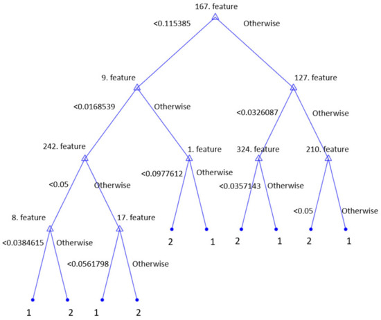 Moreover, using the presented HamletPat-based classification model, a decision-support system was created. By incorporating the 340 features selected, the decision support-system could be implemented. A graphical representation of the decision tree (pruning level = 10) for basic decision support is demonstrated in Figure 6.
