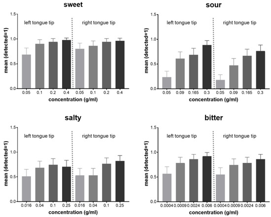 - Landis, B.N.; Welge-Luessen, A.; Bramerson, A.; Bende, M.; Mueller, C.A.; Nordin, S.; Hummel, T. “Taste Strips”—A rapid, lateralized, gustatory bedside identification test based on impregnated filter papers. J. Neurol. 2009, 256, 242–248. [Google Scholar] [CrossRef]
