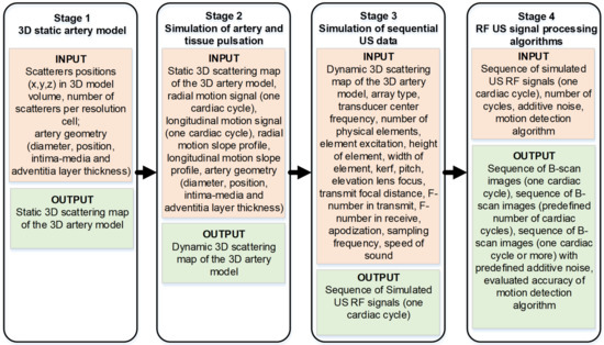 In the first stage, the artery is modeled by the static scatterer’s distribution according to the vessel’s geometry and position. Subsequently, a static artery model is modified to a dynamic one by giving the radial and longitudinal motions to 3D distributed scatterers of the artery (Stage 2). Pulsation waveforms required to input Stage 2 were obtained from in vivo representative cases as described in Section 2.2. Moving scatterers were used to simulate the sequence of scanning US RF signals for one cardiac cycle (Stage 3). At the fourth stage, US RF signals for consecutive cardiac cycles could be composed, noise and artifacts optionally could be added thus approaching a more realistic model for the application of chosen signal processing algorithms. Finally, processing of simulated US RF signals, motion estimation, comparison of motion detection results with artery and surrounding tissue pulsation data set in Stage 2 as a reference, and relative errors of motion detection were estimated.