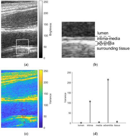 Determination of the scatterers’ scattering strength in the artery model: (a) B-scan image of the CCA; (b) detailed region (white rectangle in the B-scan image of CCA) of the distal wall with the lumen, the intima–media complex, the adventitia, and surrounding tissues; (c) variance map of CCA with preselected points from where variance values were selected to use in the artery model; (d) variance values assigned for a particular tissue of the artery model.