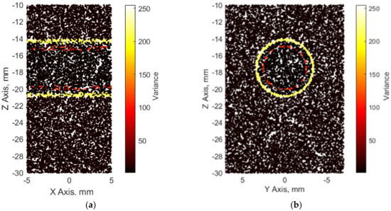 3D map of scatterers from different viewpoints representing the artery model: (a) longitudinal; (b) axial.